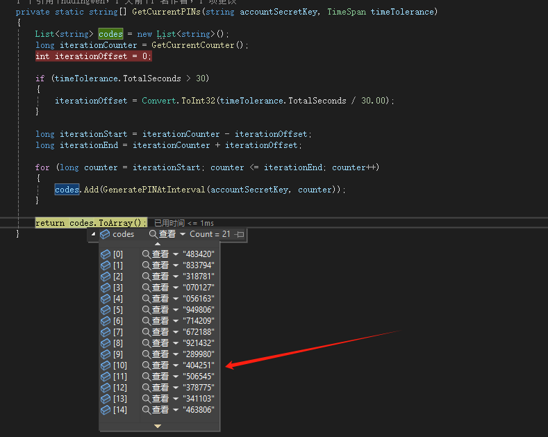 var codes = GetCurrentPINs(accountSecretKey, timeTolerance);