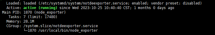 #arm平台 wget https://github.com/prometheus/node_exporter/releases/download/v1.6.1/node_exporter-1.6.1.linux-arm64.tar.gz tar -xzf node_exporter-1.6.1.linux-arm64.tar.gz cp node_exporter-1.6.1.linux-arm64/node_exporter /usr/local/bin/ #amd平台 wget https://github.com/prometheus/node_exporter/releases/download/v1.6.1/node_exporter-1.6.1.linux-amd64.tar.gz tar -xzf node_exporter-1.6.1.linux-amd64.tar.gz cp node_exporter-1.6.1.linux-amd64/node_exporter /usr/local/bin/ #进程守护 cat > /etc/systemd/system/notdeexporter.service << EOF [Unit] Description=notdeexporter After=network.target network-online.target nss-lookup.target [Service] Type=simple StandardError=journal ExecStart = /usr/local/bin/node_exporter ExecReload=/bin/kill -HUP $MAINPID LimitNOFILE=512000 Restart=on-failure RestartSec=10s [Install] WantedBy=multi-user.target EOF #启动 systemctl daemon-reload systemctl start notdeexporter systemctl enable notdeexporter systemctl status notdeexporter