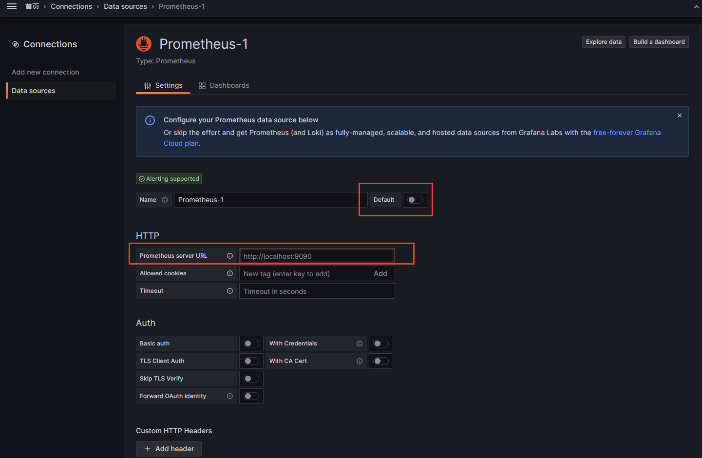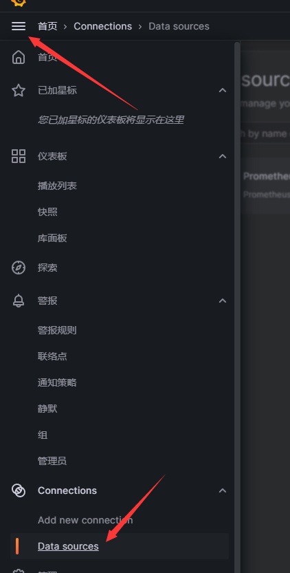 仪表盘=>Connections=>Data sources