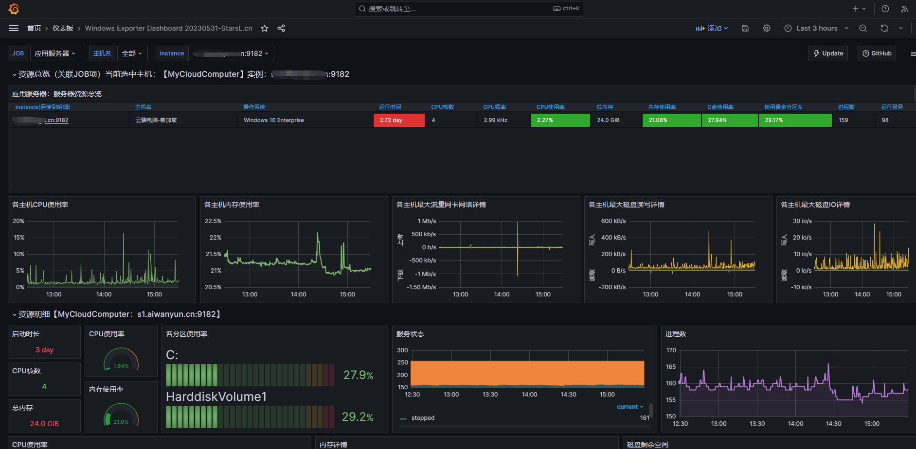 进入面板后我们就可以观察到windows的指标数据了,当我们手动停止后台收集服务同样也会触发报警